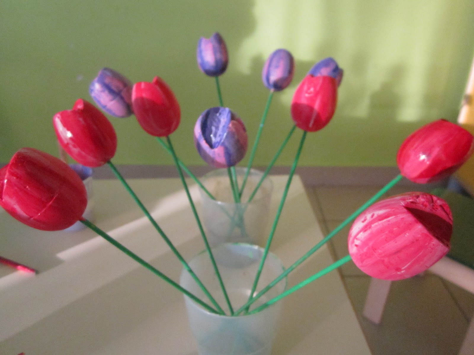 fatti con uova di polistirolo, stecchini e foglie di cartoncino punteggiate dai bambini